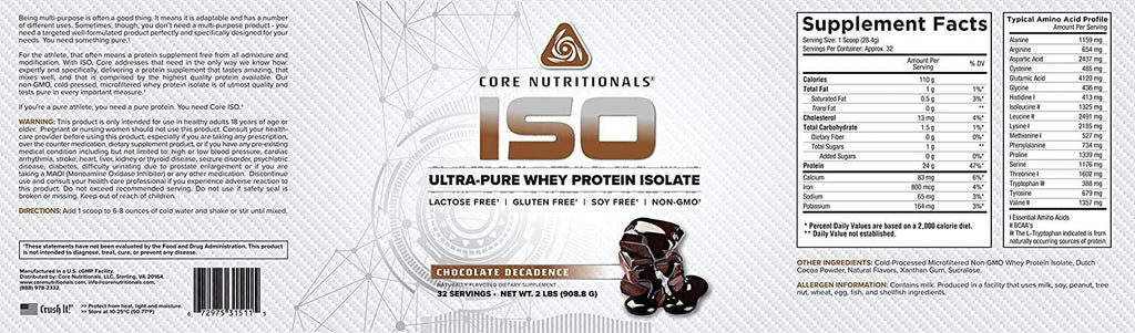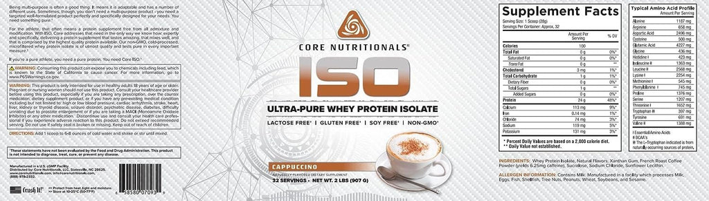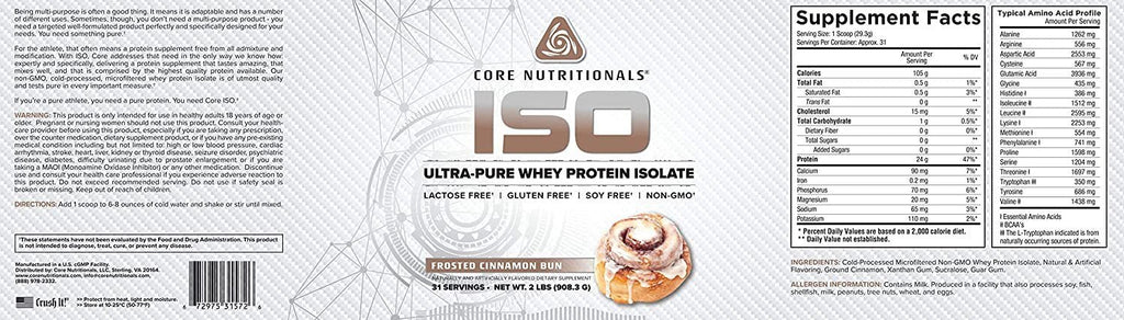 If the post-workout environment were a jungle, whey protein isolate (WPI) would be the lion – its king. Newer proteins enter into the market, receive fanfare and applause, and then inevitably fall out of favor. WPI, however, is the U.S. Dollar, Greenwich Mean Time, or Michael Jordan’s dunking prowess: it is the reference standard against which everything else is measured. The success or efficacy of all other proteins is gauged relative to what the one true king, WPI, has previously done. So, given WPI’s long-standing Elvis status, there is simply no way it could be improved on. Right? Wrong. Amino-filled and/or spiked, low quality, low purity WPI formulas still run rampant on the market – robbing consumers of what they should be receiving, and exchanging the king for a jester. That has never been Core’s approach, and it never will be. With Core ISO, we have developed the purest, highest-quality, least-adulterated WPI product on the market. We have taken the highest purity, non-instantiated, non-soy, non-GMO whey protein isolate available, and essentially added nothing to it: we have added no sugars, making it the perfect versatile protein; and we have added no artificial colors, meaning you can feel good about drinking it. Did we mention we use natural flavoring? And Oh. My. Goodness, what flavoring it is! While the bitterness of WPI overcomes most brand’s offering, and results in a dull, palette-killing powder you need to choke down, Core ISO tastes like a gourmet pastry chef set up shop, on your tongue, and started making soufflés like nobody’s business. Core ISO is, simply put, the pinnacle. Our protein’s quality and level of purity transcends it to the level of being a necessity; a part of your supplement and training setup that is simply assumed to be there, because it must be there. So, if you are already taking or planning to use protein, why not use the version of the standard that rises above the rest?